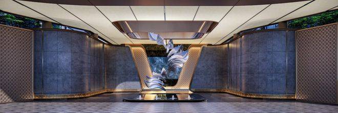 臻奢寰宇×艺术×超尺度,约95米城市超级界面·双重归家礼——蓝翡翠镜面奢石烘托,奢舞流转艺术雕塑。