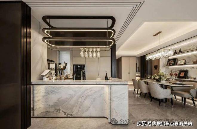 客厅背景墙的“烟雨江南”天然大理石,不同于传统平面背景墙,通过弧度及立体的造型处理,并镶嵌不锈钢材质,对于金茂而言,比奢石昂贵的,是让奢石真正与空间气场融为一体。