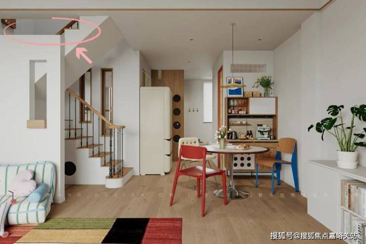 摩登波普条纹沙发+红色邦妮餐椅的组合,设计师没有回避色彩冲突,既可以慵懒地躺在沙发上沉浸思考,也可以坐在红色椅子上尽情享受美食,这种静态平衡,无形中默默调度生活节奏。
