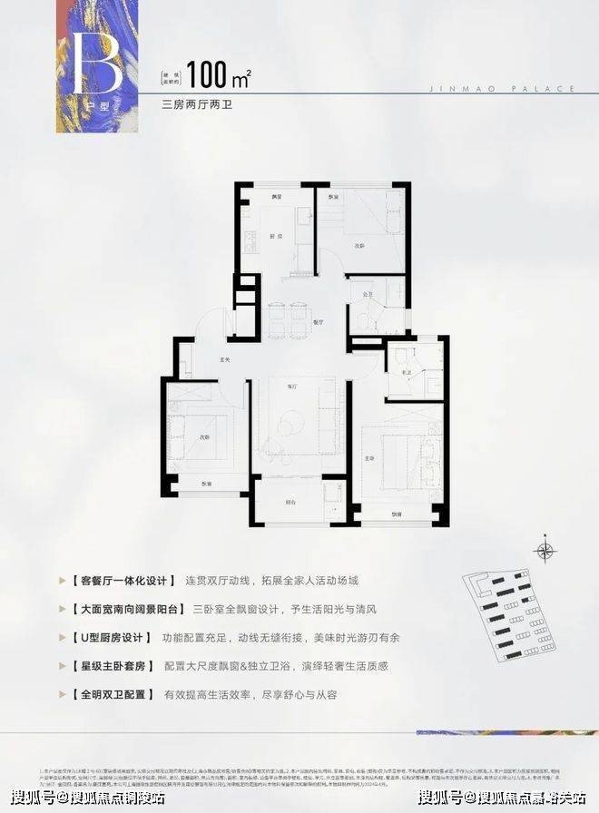 建面约100㎡3房2厅2卫户型