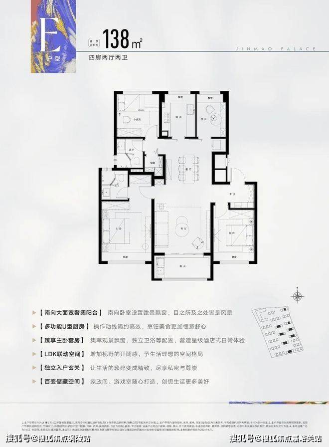 此户型为飞机户型,可以说是改善人群非常喜欢的户型,建面约138㎡4房2厅2卫设计,动静分区,三开间朝南,各空间尺度奢阔,还有一个大面宽景观阳台,实现功能性和舒适度兼得。