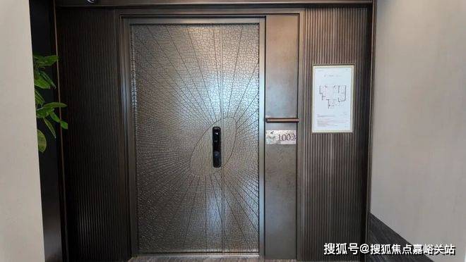除105㎡以外的大户型(117㎡、143㎡),均为这种子母门设计,非常大气。每户门旁都有一个带射灯、奢石背景以及项目LOGO的门牌号。