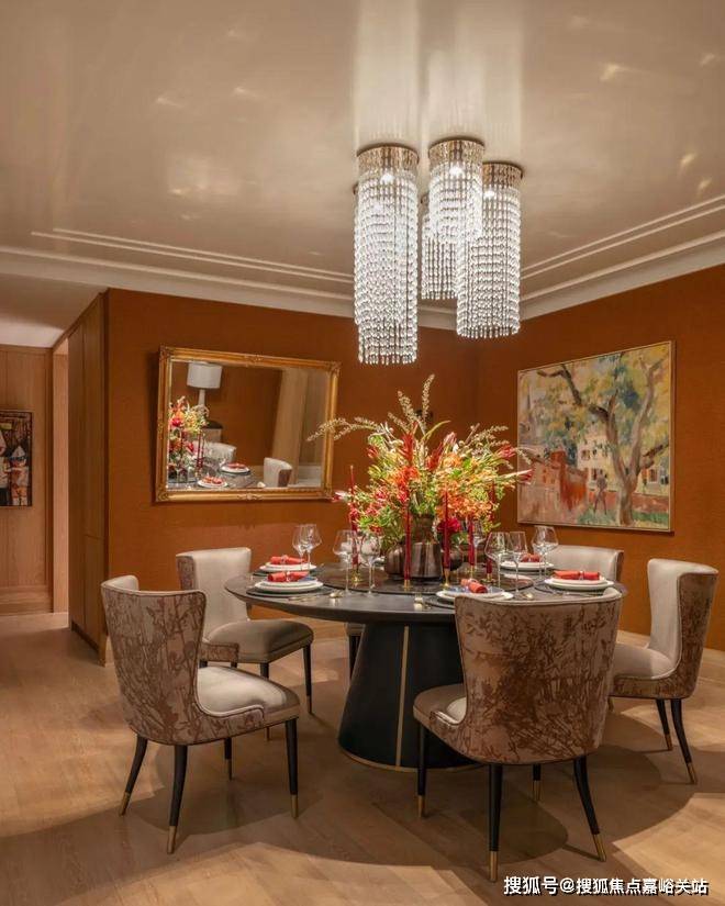 餐桌上盛放的热带花卉与橘色亚麻帆布面壁纸,一同传递出热烈的情感,一幅展现自然风光的画作《The Old Walnut Tree B》丰富了空间的色调,在贵雅的氛围中妆点质朴与原始的美。