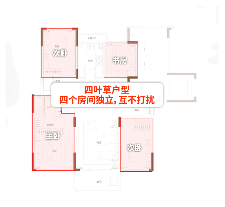 四房间呈四叶草布局分布于户型四角,互不打扰;