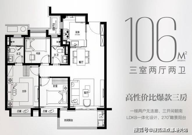 建面约106㎡3房:无连廊,高得房率!