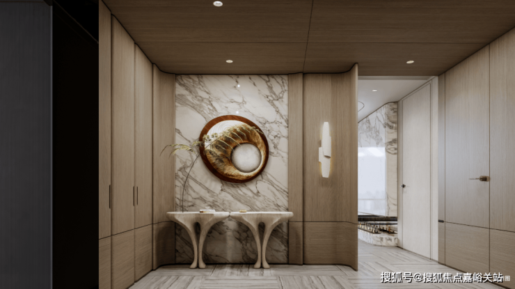 用料上,部分以冰火板+岩板打造的车行道廊柱、仿透光云石定制车牌号、部分主干道全铝板吊顶,无不显示出业主的归家气场。