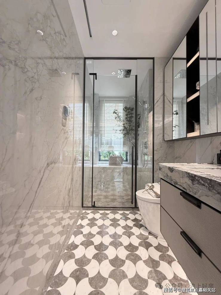 卫浴方面,地面及淋浴区,全部选用石材,墙面的 公主白玉岩板,温润暖色调,质感非凡。