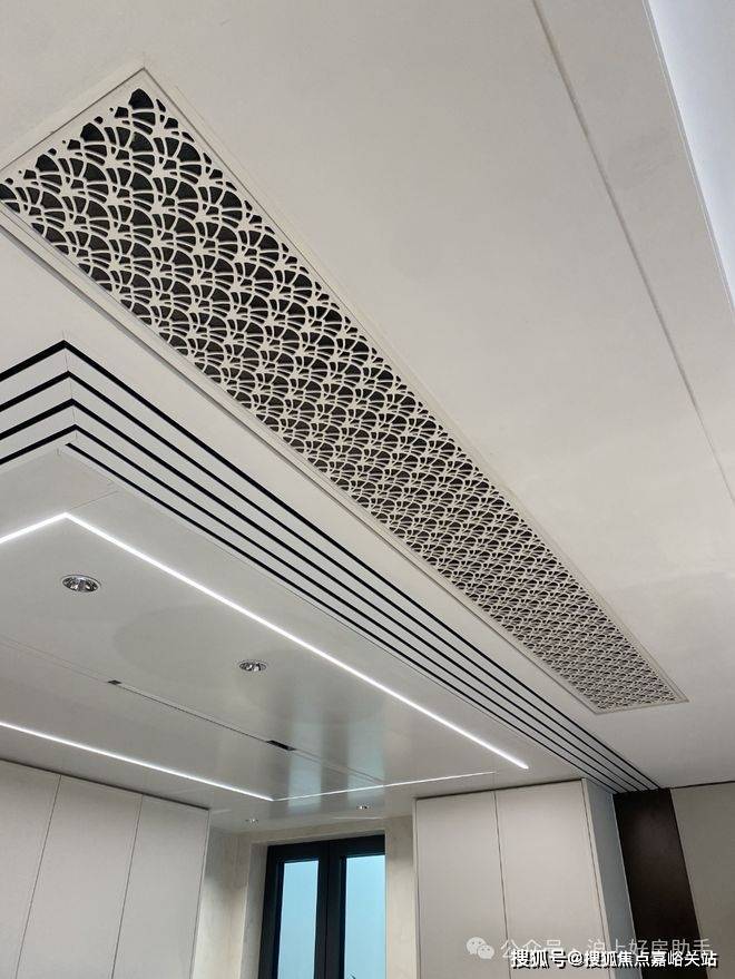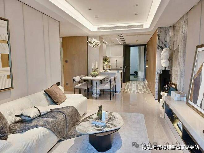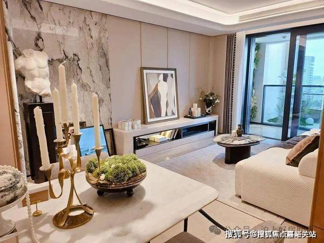 海上清和玺售楼处电话4008569058☑️☑️电视背景墙采用卡慕白的石材+皮革造型,弧形吊顶,相当讲究,连空调出风口的形状都打造为海上·清和玺logo山茶花的形状~~三大件为大金(或同等档次)中央空调和地暖,新风系统为百朗(或同等档次),南向阔景阳台,采光视野一级棒!海上清和玺售楼处电话4008569058☑️☑️