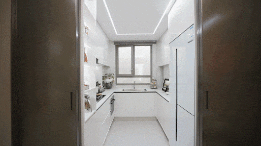 开放式厨房在U型操作台面的基础上,还能放下双开门冰箱;