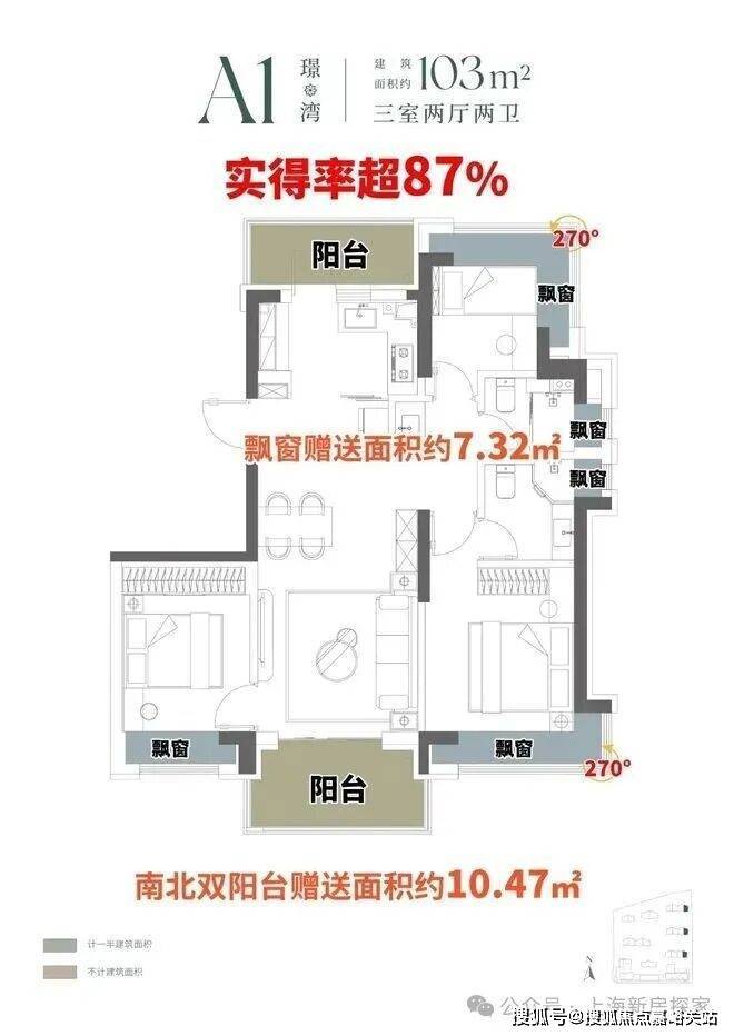 前滩东方湾售楼处电话☎:400-856-9058☑️☑️建面约103㎡A1户型,约10.47㎡南北双阳台空间,阳台“买1赠1”,赠送约5㎡,南侧观景阳台,北侧功能阳台,更附赠约7.32㎡飘窗,实得率超87%。前滩东方湾售楼处电话☎:400-856-9058☑️☑️