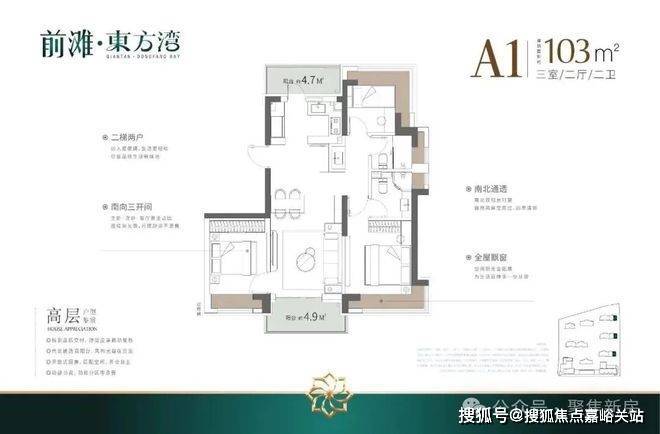 建面103㎡3房2厅2卫,户型三开间朝南、室内“5个飘窗+2阳台”,不管是采光、视野、通风、私密性,还是实用性都十分出色。