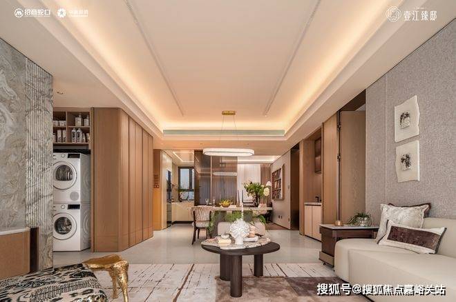 2、4大MAX收纳空间:餐厅配备大通顶柜,实现高效收纳;厨房采用U型设计,极致收纳空间包括天使拉篮(顶部反光板)、多功能墙面收纳及墙面调味篮,并配置家政柜,卫生间提供个性化收纳方案。