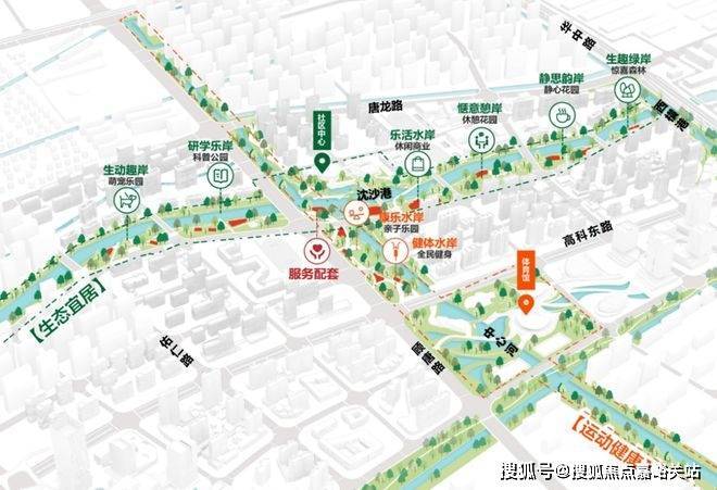 项目近距离内被唐镇公园、唐丰公园、华夏公园、张江科学城中央公园、4大公园环绕,这些都是城市稀缺的大型城市绿肺,天然氧吧,在为居民提供休闲,亲近自然的好去处的同时提供高浓度的负氧离子,净化空气。未来金城片区还将依托沈沙港、中心河打造特色蓝绿空间“十字绿轴”,构建连续滨水慢行网络和社区中心,集中营造多主题、多层次的主题岸线,形成丰富多样、有活力的水岸空间。