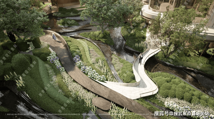 三层归家动线: 从地面景观层到架空层,再到入户层,穿越绿植、光影与水景,步步进入私域。