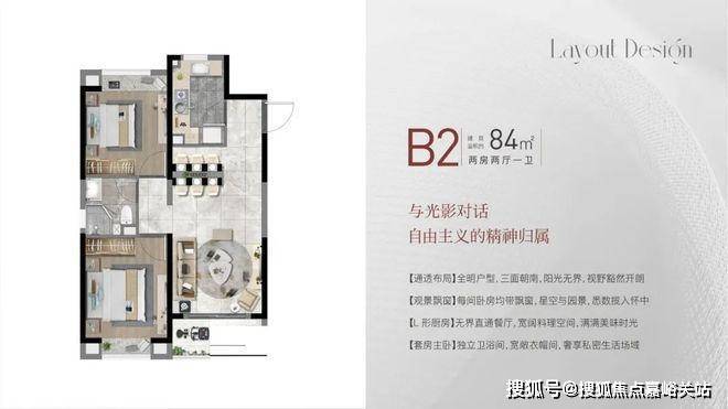 建面约84㎡2房2厅1卫,做到了 双开间朝南+双卧室带飘窗+动静分离,非常宽敞的2房户型。
