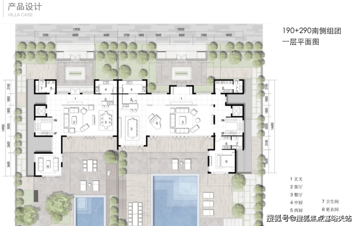 北入户的190+290房型,一层朝南直面庭院和泳池,如果配上整扇的落地玻璃移门......