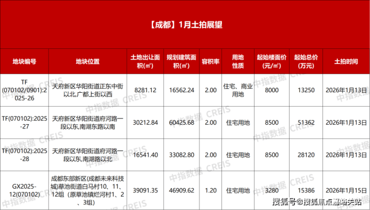 截至目前,成都已公告了4宗涉宅用地将于1月份出让,其中1月13日出让3宗天府新区华阳街道涉宅用地,3宗地块组合出让,起始总价约9.27亿元;1月15日将出让一宗东部新区宅地,起始总价约1.54亿元。