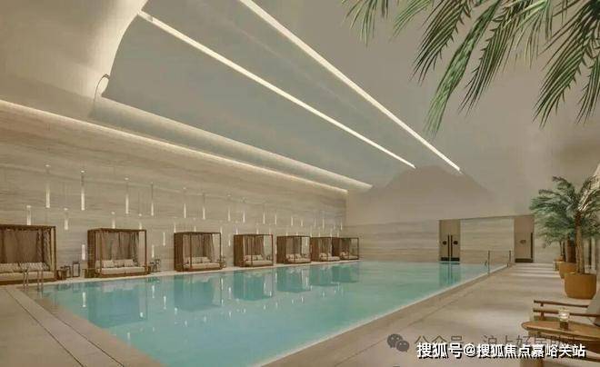 会所内的泳池上方做流畅且立体的吊顶线条,造型现代且富有层次感。这样的设计不仅提升了空间的视觉效果,更营造出一种轻松、悠闲的度假氛围。