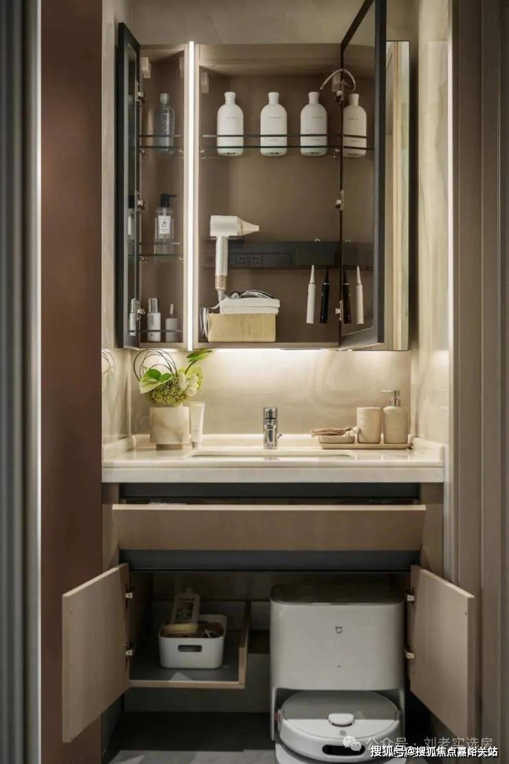 并且在台盆下方做了袋鼠抽柜体,下方预留扫地机器人充电点位,比起传统的抽拉柜体更实在。