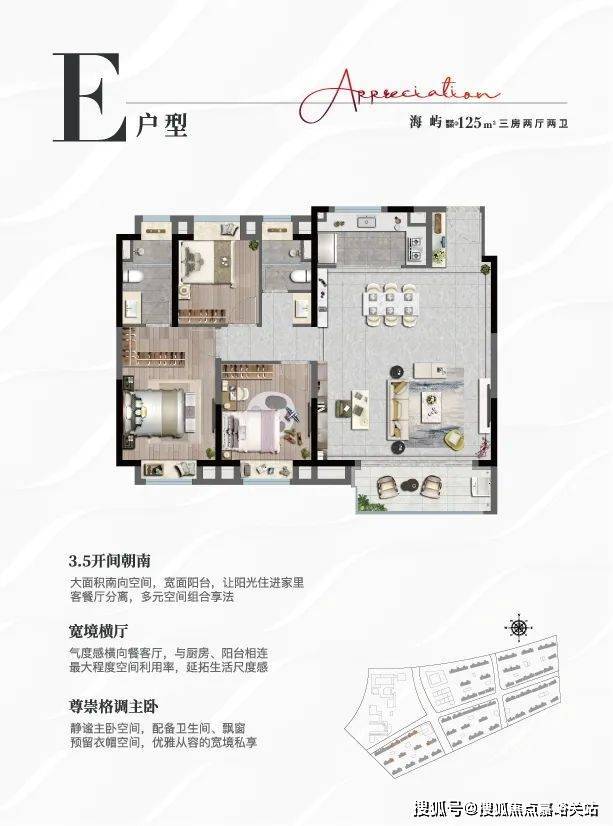 宽景尺度横厅,四开间朝南,阳台、飘窗打造连续景观界面。