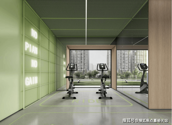 健身房 - 悦活天地:封闭管理,提供专业健身环境,空间内设跑步、拉伸、动感单车、休息、力量训练、水吧等功能区。