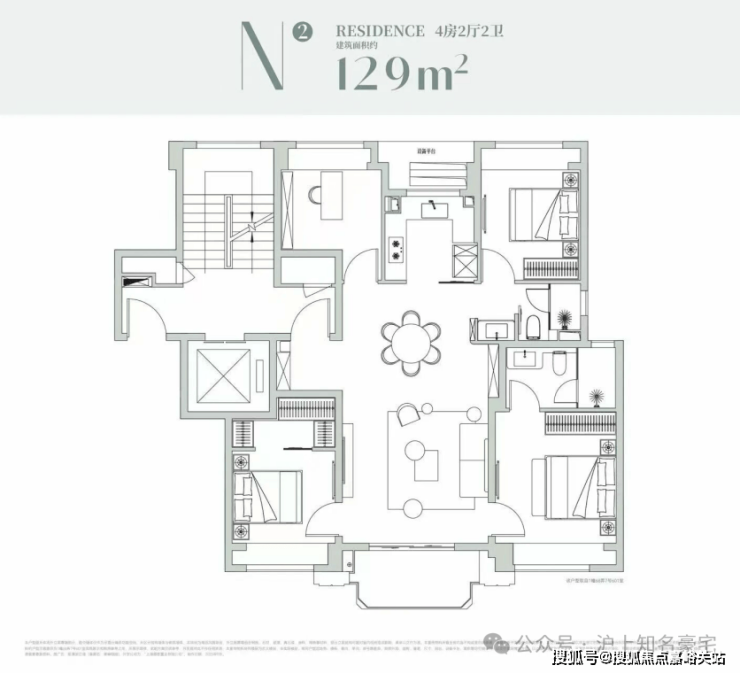 该户型是经典的四叶草布局,四开间分布在四角,兼顾私密与互动,是二胎家庭的优选!
