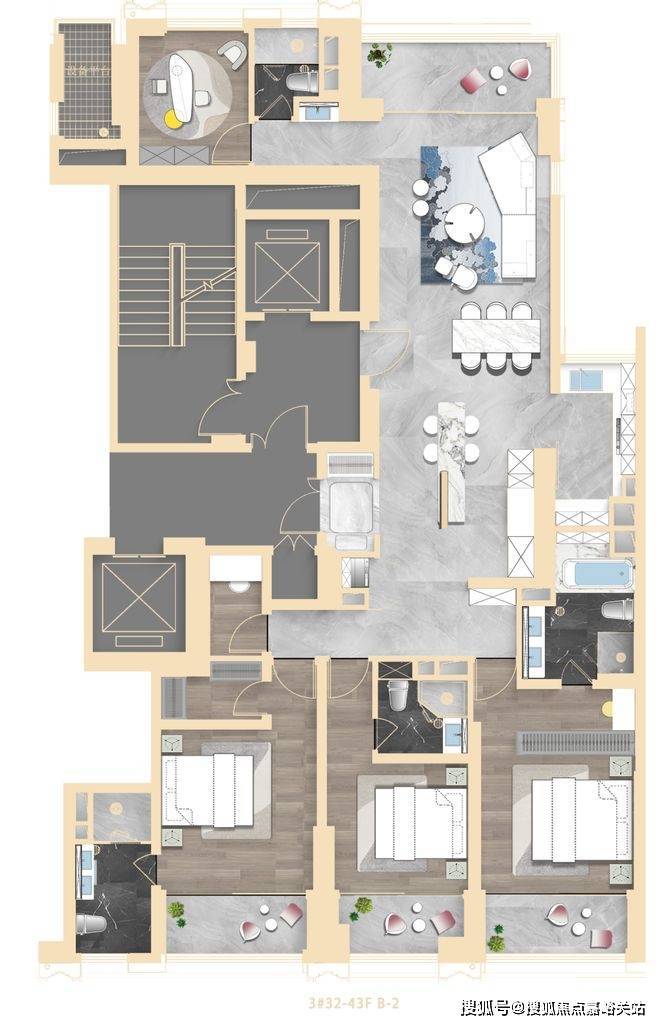 项目中心坐落的中央景观规模约3000㎡, 周边环绕着四座建筑,其中三幢为超高层设计,整体布局高低兼顾,启承有序,开阖有度,塑造城市云端生活新方式。