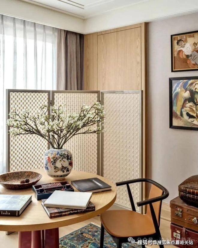 多功能书架彰显着设计的巧思,形成有如博物馆般的展示方式,即可放置日常读物,亦可展示珍本藏书。同时,利用屏风做隔断,与圆桌结合形成私密空间。