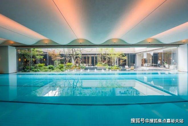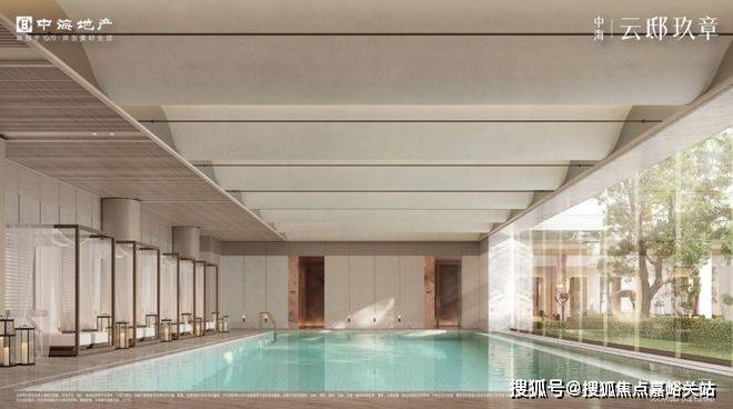 最后来看泳池。云邸玖章做了再升级。改为采用大尺度的落地玻璃拼接,约2.4米宽巨幅玻璃,且通过精致的玻璃交接细节处理增进室内外空间的融合,强调泳池的无界感,真正实现了无边泳池的效果、质的飞跃。