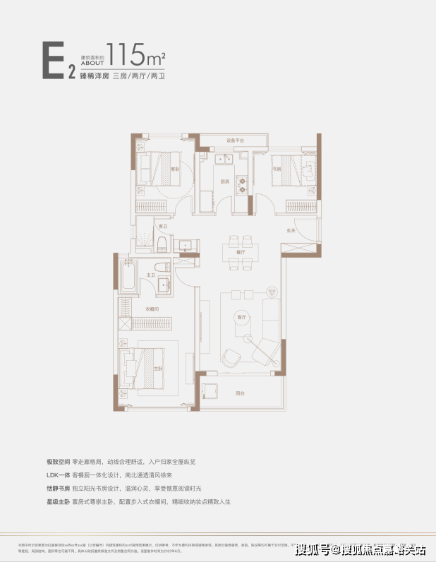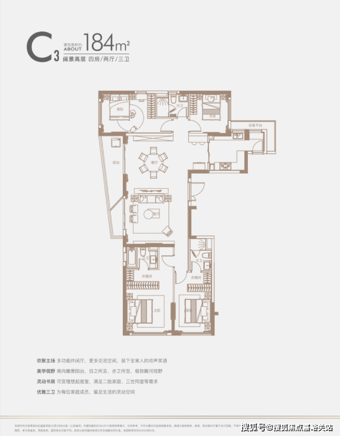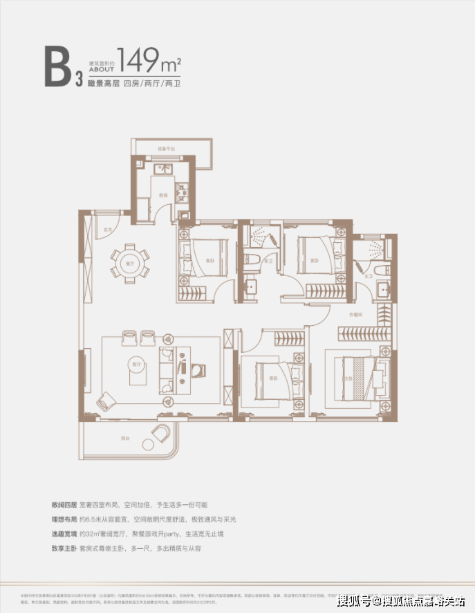 建面约140㎡四房: 三开间朝南户型,南北通透,采光条件优质,客厅明亮宽敞,彰显大气布局。