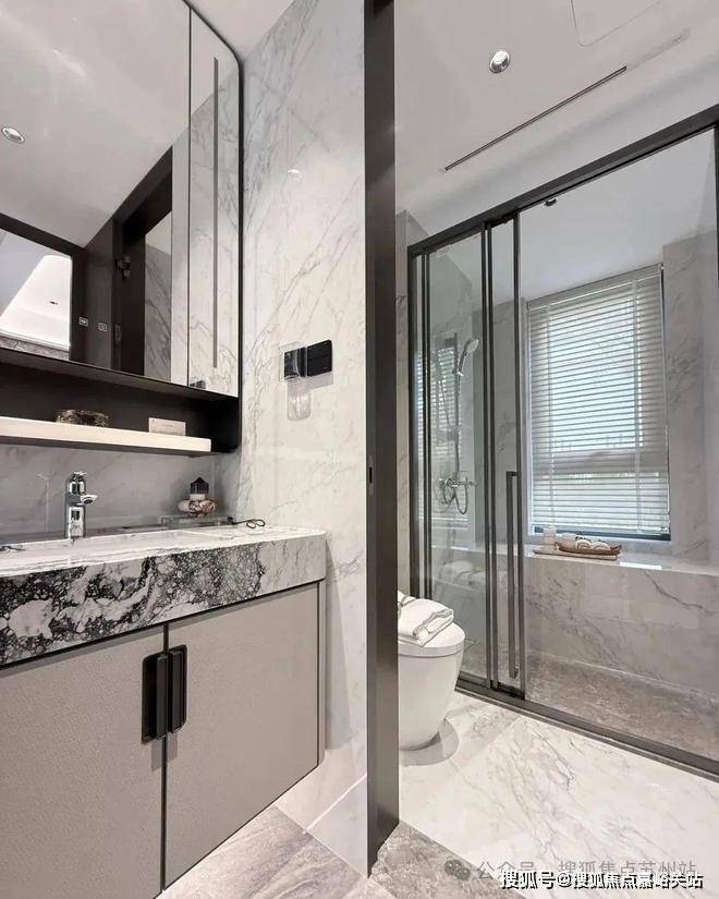 海上清和玺售楼处电话:400-856-9058☑️☑️奢石台面,皮革饰面柜抽屉,侧端设置金属收纳开放格;定制镜柜,中间的透光玉石直接提升了高级感,镜柜内部配备了美妆冰箱+美妆灯条+轨道收纳!海上清和玺售楼处电话:400-856-9058☑️☑️