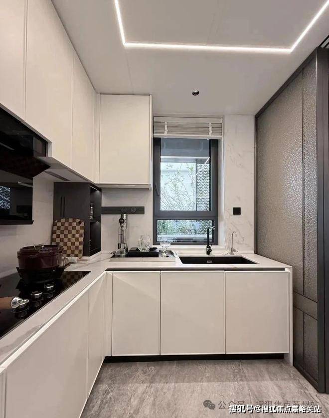 海上清和玺售楼处电话:400-856-9058☑️☑️进门可以看到经典的S墙设计,L型厨房操作台面,也是暗藏不少细节——玻璃移门采用完美系列夹丝玻璃+金属造型边框,顶部配置线性凉霸+LED嵌入式回形灯带+筒灯,海上清和玺售楼处电话:400-856-9058☑️☑️灶台后侧采用大面积岩板铺设,方便清洁的同时显得厨房更加大气。海上清和玺售楼处电话:400-856-9058☑️☑️