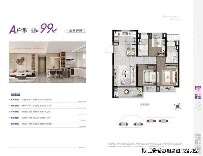 深嘉上府开发商预约热线:400-8854-706✔✔上海嘉定深嘉上府售楼处电话☎:400-8854-706✔✔✔建面约99㎡的三房两厅两卫,很适合一家三口的上车作品。三开间朝南,南北通透,动静分区,户型方正。全屋飘窗,扩大实用面积,节省置业成本。主卧采用套房式设计,满足业主的私密性需求。户型内空间充分利用,整体尺度感超过同面积段的市面上产品。