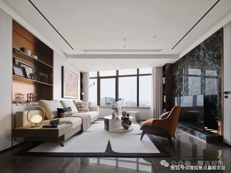 客厅转交采光面,配置弧形沙发,窗前望去上海三件套尽收眼底;