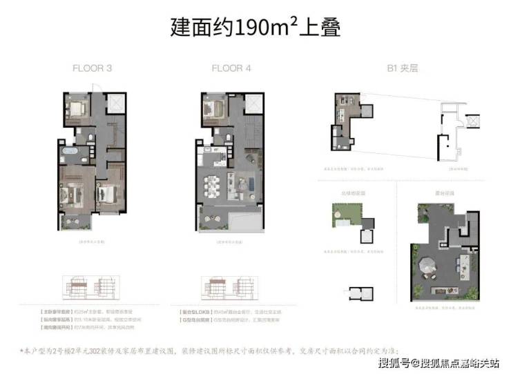 首先,项目清一色的都是四层的上下叠配置,垂直空间内只有两户业主,私密性、静谧性都更加出色。其次,来看户型: 在所有叠墅户型中,下叠往往是更具“墅感”的,我们以主推的建面约200㎡下叠产品为例,来解析一下这个产品: