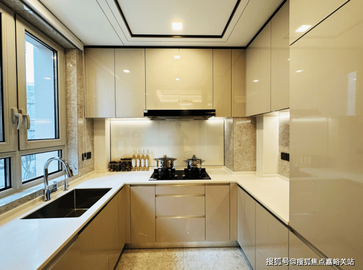 冰箱直接升级为隐藏门嘉格纳双开门冰箱,更配备了嘉格纳蓝色珐琅专利烤箱,厨房灶台后采用整块玻璃,避免油渍难清洗的问题。