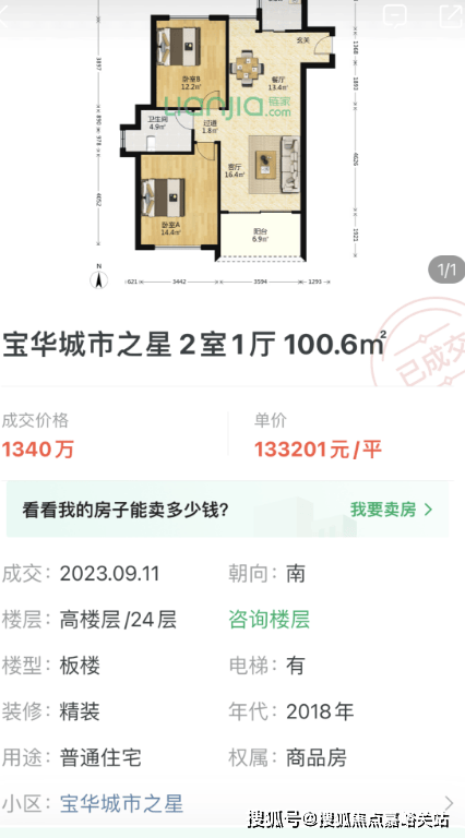 但是,现在在二手房市场,宝华城市之星,一枝独秀,某绿皮网站显示,项目在今年9月11日就成交了一套100㎡房源,成交单价高达13.3万!
