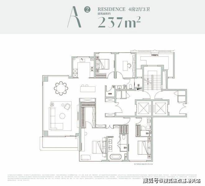 该户型是经典的四叶草布局,四开间分布在四角,兼顾私密与互动,是二胎家庭的优选;