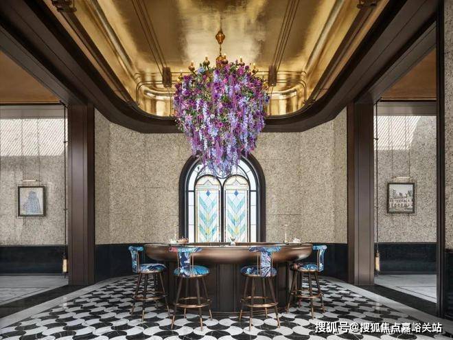 另外,项目在材质上大量运用奢石。比如项目的门楼采用了上海海鸥丽晶酒店同款巴西金石材。接待大厅采用进口奢石巴西乌金石打造的大理石柱。接待台则采用玻利维亚蓝,这是世界上储存量极少的石材之一,被称为奢石中的劳斯莱斯。随处可见Old money奢华风格。