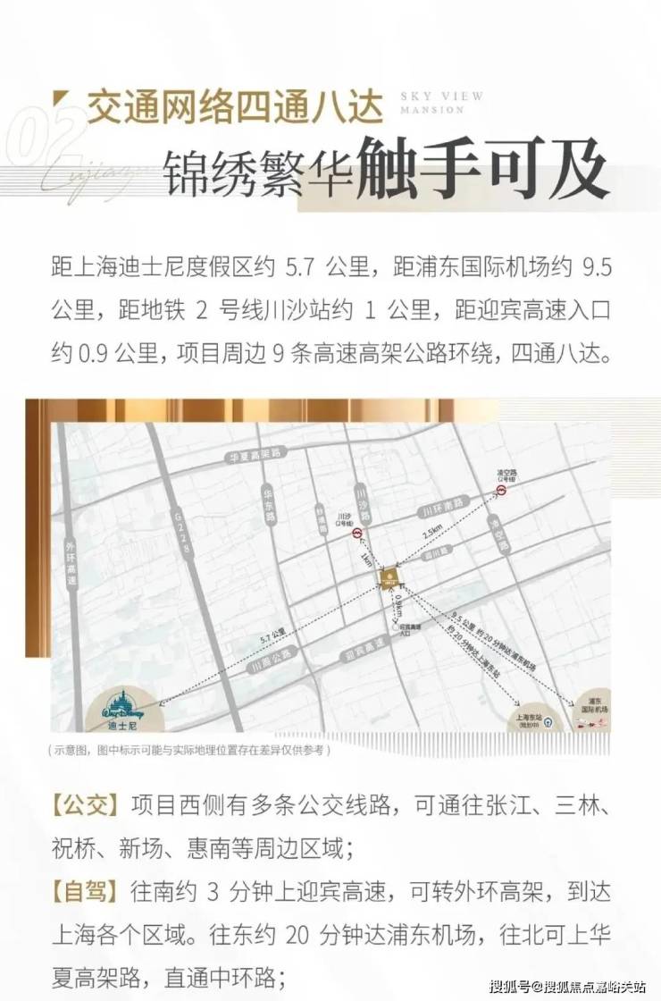 交通:2号线川沙站900米,6站到张江,7站到龙阳路,可换乘多条轨交路线。公交:抵达张江,祝桥,惠南,唐镇等周边区域。 自驾:3分钟上迎宾高速,可转外环高架,到达上海各区域。往东约20分钟可达浦东机场,往北可上华夏高架路,直通中环路; 高铁出行:上海东站已经开工建设,距项目车程20分钟左右。