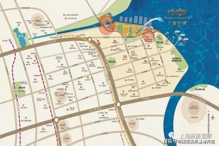 「上海长滩」紧邻逸仙路高架,与上海内环无缝对接!高架快速直达人民广场、杨浦、虹口!是上海难得一见的集自然资源、地理位置与交通优势与一身的滨江宝地!