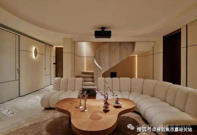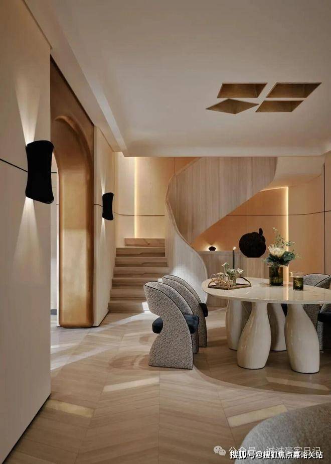 顺着弧形木质楼梯抵达地下空间,仿佛游走在一曲流动的乐章中。一切都共同呼应着水的特质,传递着低调隐逸情怀与圆融个性。