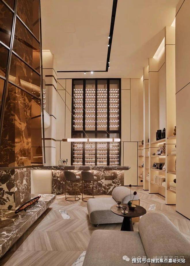 这一层更聚焦于私谈、影音、娱乐、品酒、饮茶,深沉又静谧。近6米高的垂直挑空玻璃壁炉矗立于眼前,如同一件令人赞叹不已的大型雕塑装置,它弱化了空间中的大理石承重柱,将其纳入共同构成一个完整的全新的装置,集功能性与艺术性于一身。