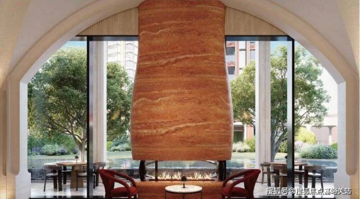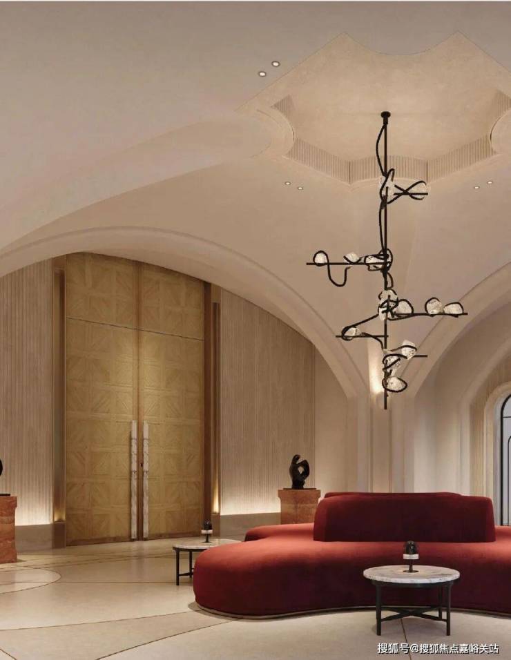 大堂位于主入口。米白色调为主,中辅以温暖红橘色调,拱形吊顶、铁艺花门和拼贴机理大理石地面交织复古与现代。枝形吊灯散发出艺术光芒,红洞石装置与室外红砖立面遥相呼应。复古橘色非围合沙发洋溢着温情,四向座席无主次之分望向室内或花园,四向皆景。
