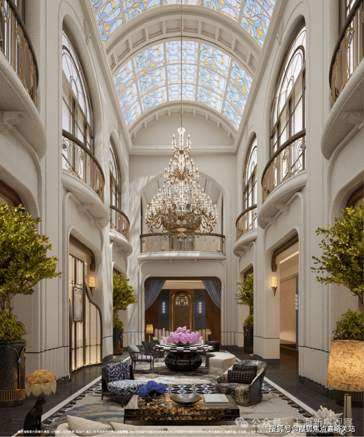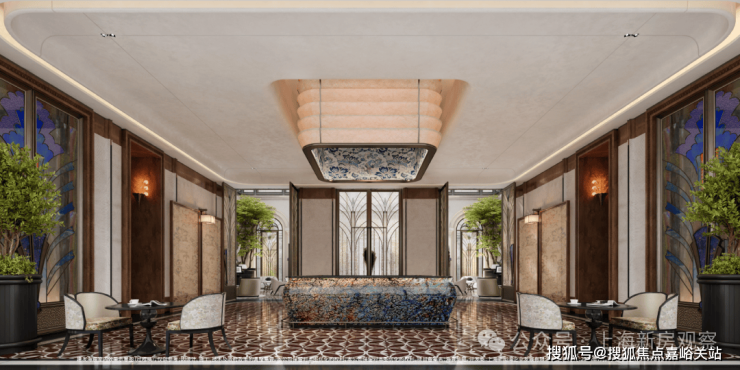 示范区以 “玉兰门庭—迎归大堂—莳花荟” 为核心轴线,运用非遗技艺与奢贵石材打造。 约65米长玉兰门庭融合海派元素,9米挑高迎归大堂 ,汇集多位艺术家跨界作品,莳花荟中央会客厅再现海派社交场景。