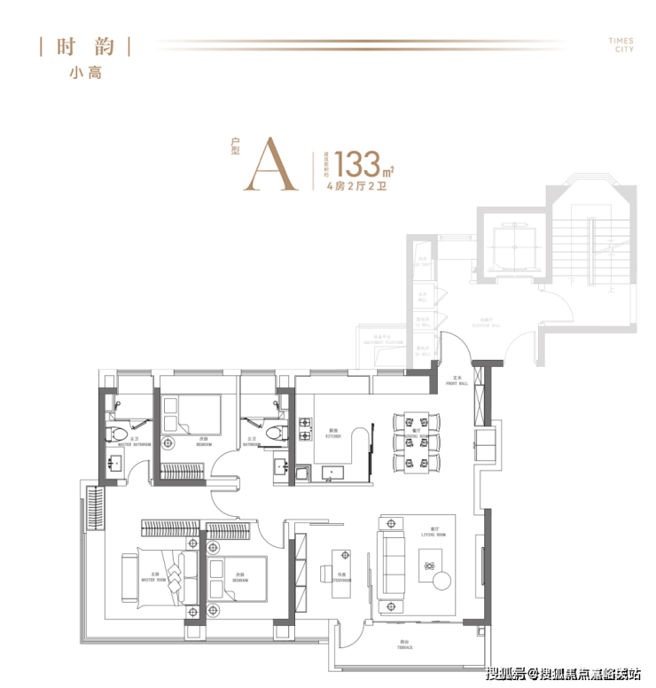 建面约133㎡4房(小高)约5.9m大面宽大横厅+主卧270°转角窗