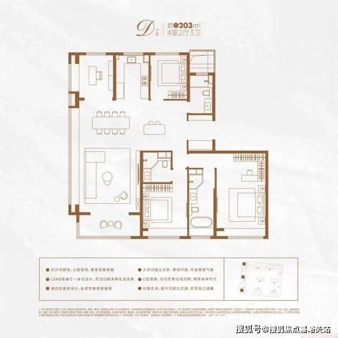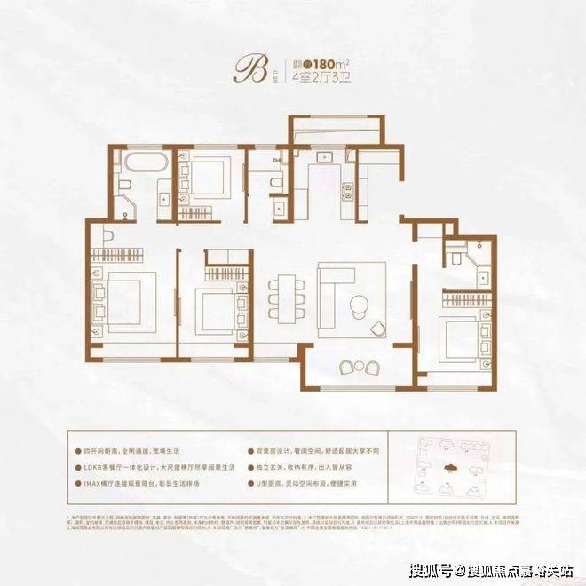 该户型集LDBK一体化、玄关入户、动静分区设计、U型厨房、双卧飘窗、强大收纳等多重优势于一体,在功能性与舒适度上几乎都做到了极致!