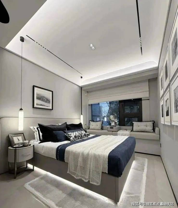 主卧转角落地窗+飘窗,也算是非常少见的了。净面宽约3.6m,不算进门的衣柜,进深大约5.7m左右。根据测算,可以放置宽约2m的床+2个床头柜(宽度约45cm/个)是可以的。