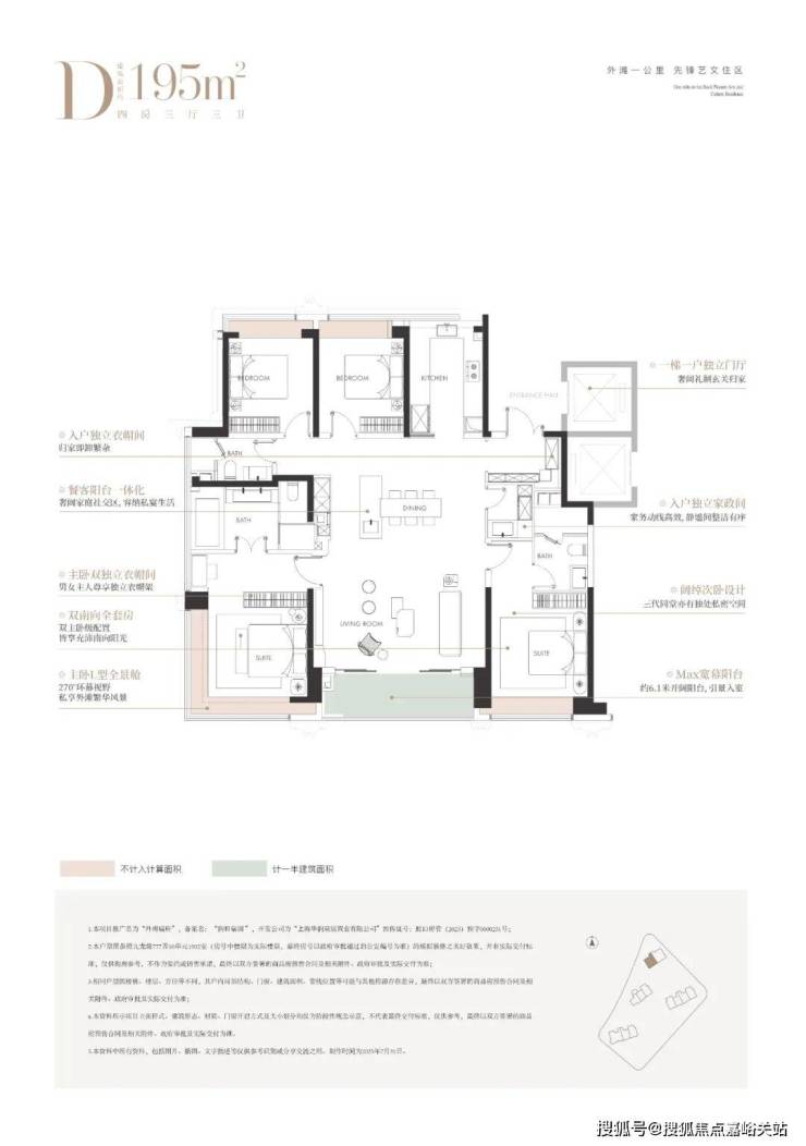 大横厅尺度感奢阔,尊享私梯入户,隐私性满分!三间卧室朝南设计的平权户型,老人、小孩均可享受南向采光;厨房转角窗、主卧套房、北向书房均配置270度转角飘窗,景观视野相当不错!次卫四分离设计,相当人性化~