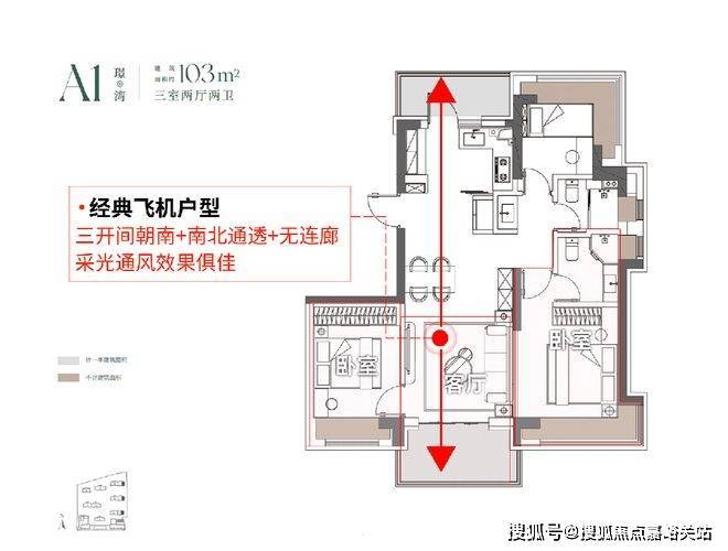 建面103㎡3房2厅2卫,户型三开间朝南、室内“5个飘窗+2阳台”,不管是采光、视野、通风、私密性,还是实用性都十分出色。